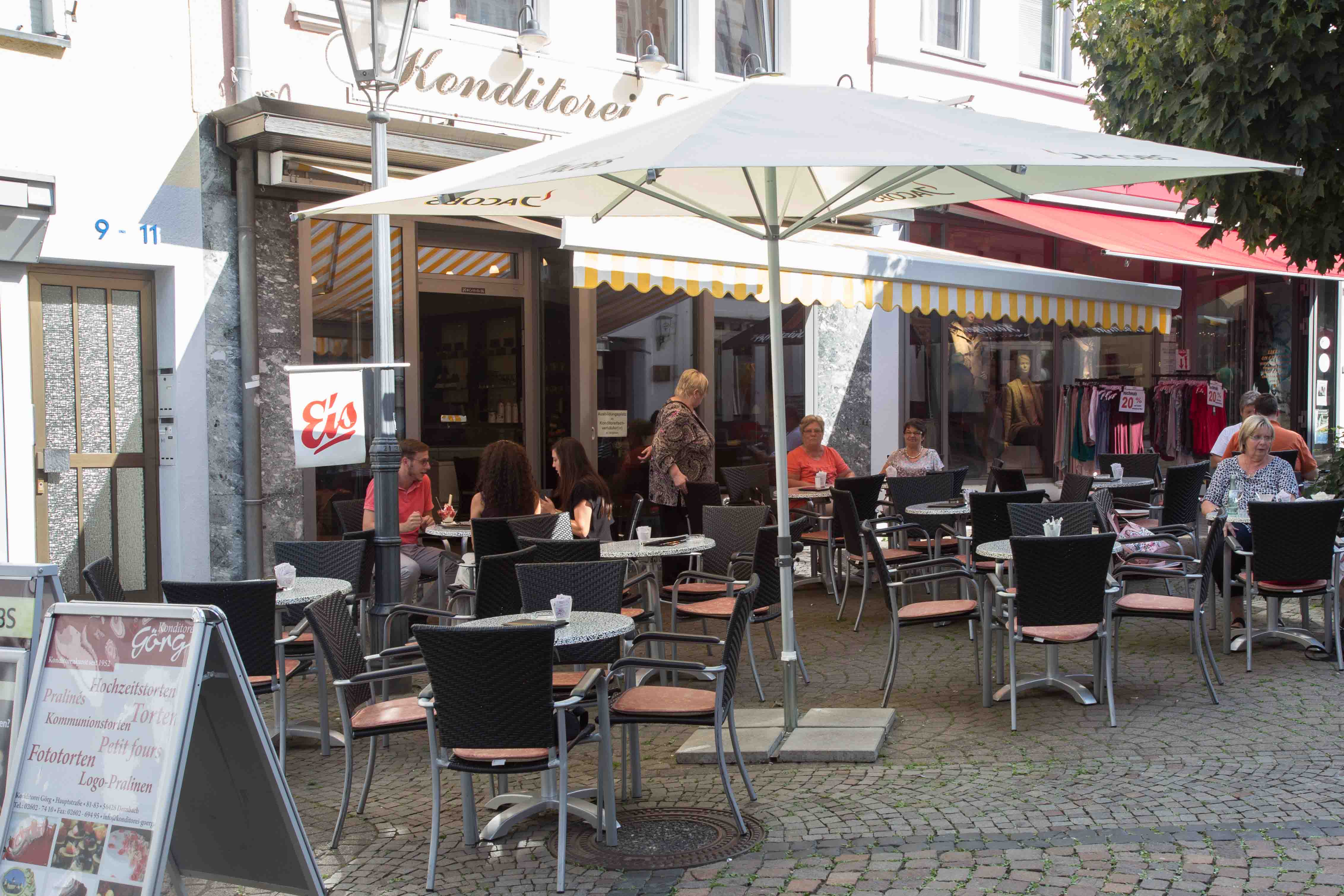 Und in genau dieser Altstadt, deren Bild von Fachwerkhäusern bestimmt ist, liegt unser Café Görg. Es besticht nicht nur mit seiner perfekten Lage in der Fußgängerzone, sondern auch mit seiner hohen Qualität an feinster Konditoreiware und tollen Frühstücksangeboten. Das Café Görg liegt in der Nähe des Montabaurer Schlosses, dem Wahrzeichen der Stadt. Auch der Aussichtspunkt vom Karoline-Kahn-Platz liegt direkt um die Ecke, von welchem man einen unvergleichlichen Blick auf den „neuen“ Teil der Stadt hat. Dort sieht man z.B. den ICE-Bahnhof und das Fashion Outlet Montabaur, das nur etwa 15 Minuten zu Fuß vom Café entfernt liegt. Auch die Busverbindungen sind top ausgebaut, sodass man nach einem ausgiebigen Shoppingausflug den schönen Tag bei einem Kaffee und einem Stück Torte in unserem Café ausklingen lassen kann.